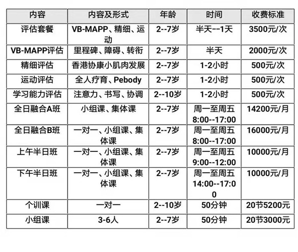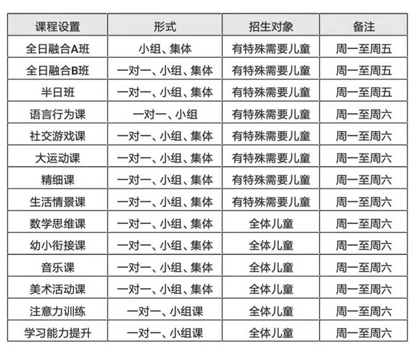 课程内容:ABA语言行为课、言语课、职能课、感觉统合课、社交游戏课、自然情景课、数学思维课、音乐游戏课、美工课、体育课、学习能力提升课等